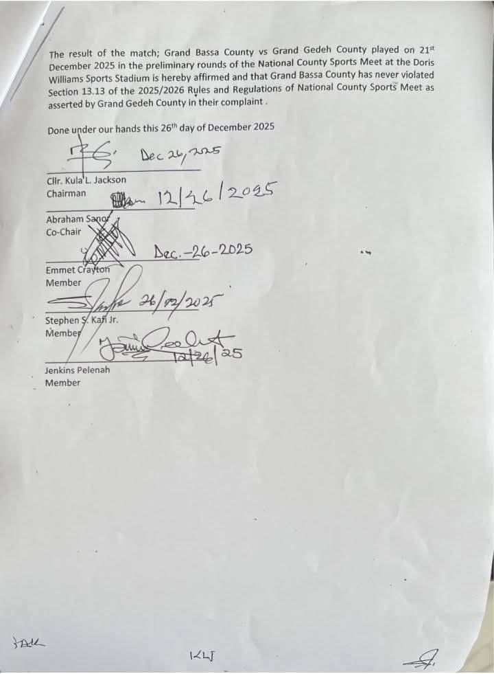 Based on these findings, the Grievance and Disciplinary Committee ruled that the result of the match played on December 21, 2025, at the Samuel Kanyon Doe Sports Complex be reversed. Grand Cape Mount County has been awarded three points and two goals in accordance with the 2025–2026 National County Sports Meet Rules and Regulations.